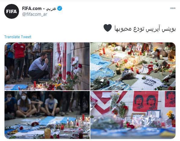 وكتب الاتحاد الدولى لكرة القدم "فيفا" عبر تويتر "بوينس آيريس تودع محبوبها".