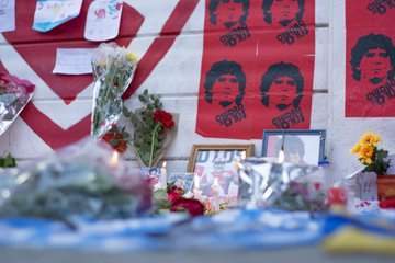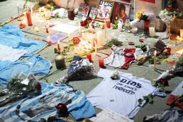 وتظهر الصور وداع محبي مارادونا له بالشموع والزهور والصور الخاصة به وقمصانه التي ارتداها أثناء فترة لعبه بمنتخب الأرجنتين.