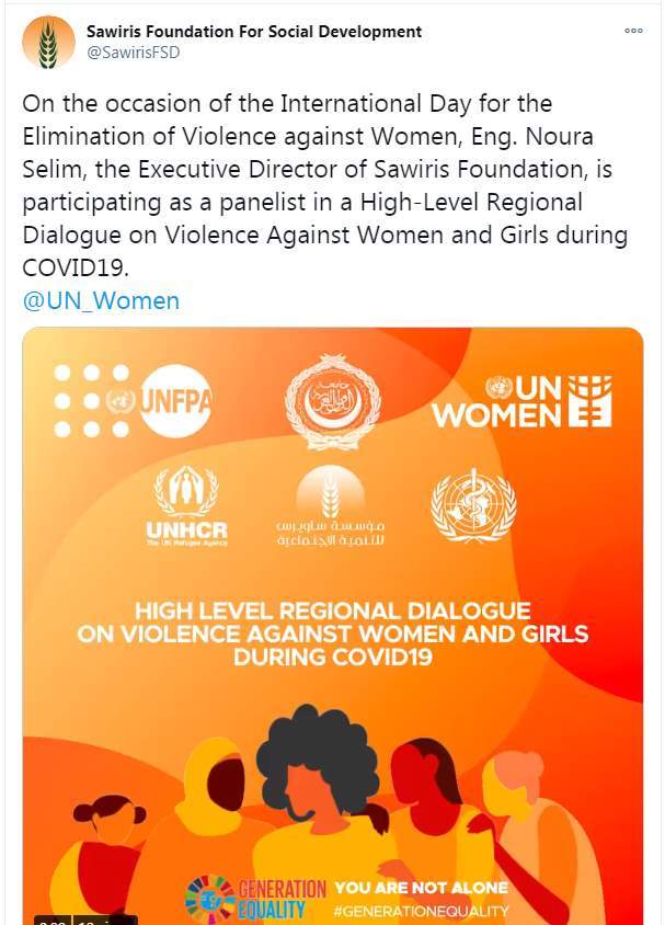 وكتبت مؤسسة ساويرس للتنمية الاجتماعية تغريدة على تويتر: "بمناسبة اليوم العالمي لمناهضة العنف ضد المرأة مهندسة نورا سليم، المديرة التنفيذية لمؤسسة ساويرس، تشارك كعضوة في الحوار الإقليمي رفيع المستوى حول العنف ضد النساء والفتيات أثناء أزمة كورونا COVID19 مع هيئة الأمم المتحدة للمرأة".