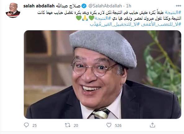 وغرد الفنان صلاح عبر "تويتر"، قائلًا: "النتيجة طبعاً بُكره مفيش حبايب في النتيجة، لكن لازم بكره وبعد بكره نفضل حبايب مهما كانت النتيجة، وكلنا نقول مبروك لمصر وتبقى هيا دي النتيجة"، مزيلًا التغريدة بهاشتاج "#لا_للتعصب_الأعمى #لا_للتحفييل_الغير_مُهذَب".