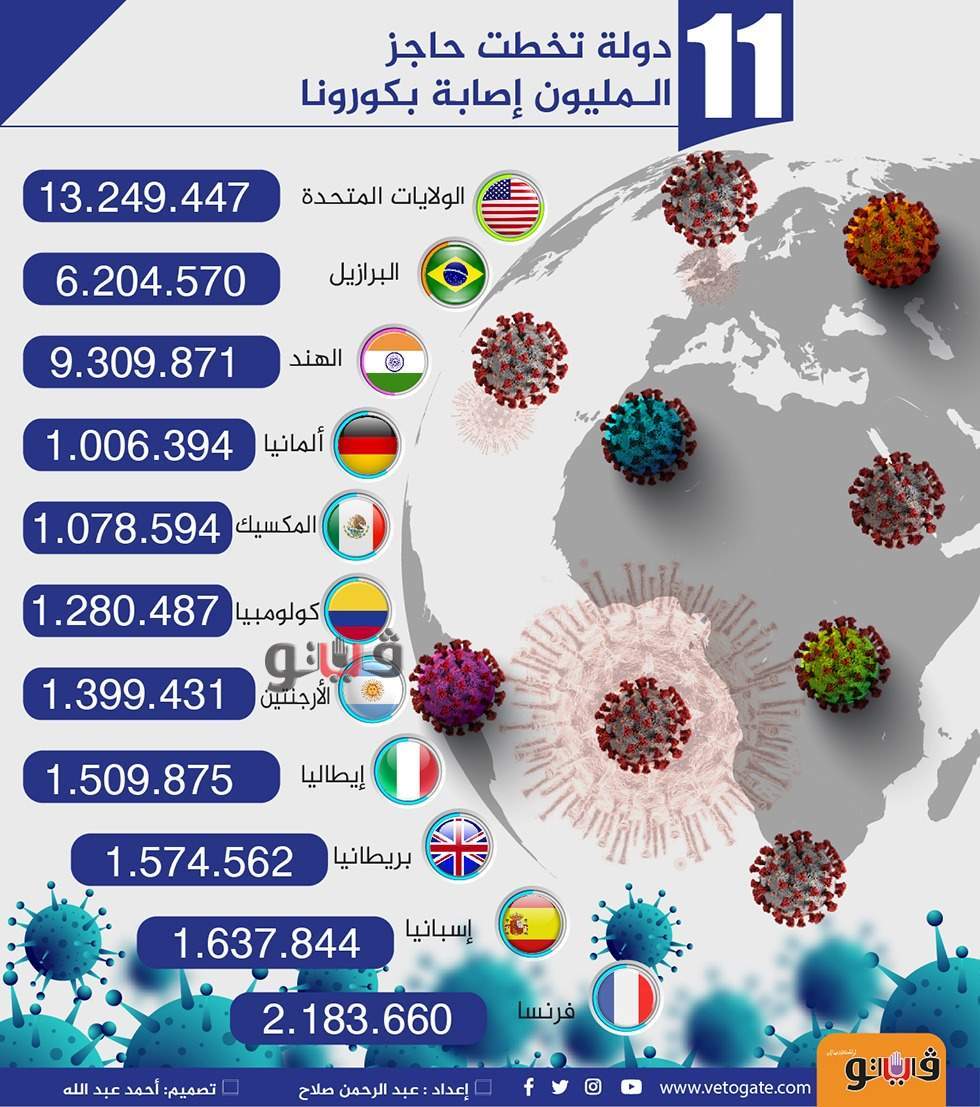 11 دولة تخطت حاجز المليون إصابة بكورونا | إنفوجراف الأحد 29/نوفمبر/2020 - 03:50 م 11/29/2020 3:50:09 PM 11 دولة تخطت حاجز المليون إصابة بكورونا عبدالرحمن صلاح شارك طباعة 18 حجم الخط شارك طباعة روسيا بريطانيا الهند البرازيل الولايات المتحدة فيروس كورونا إيطاليا