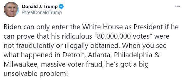 وقال ترامب في تغريدة عبر حسابه على موقع التواصل الاجتماعي "تويتر": "|لا يستطيع بايدن دخول البيت الأبيض كرئيس إلا إذا تمكن من إثبات أن "80,000,000 صوت" لم يتم الحصول عليهم عن طريق التزوير.. عندما ترى ما حدث في ديترويت، أتلانتا ، فيلادلفيا وميلوكي ، والتزوير الهائل في أصوات الناخبين ، تكتشف أن لديه مشكلة كبيرة لا يمكن حلها!".