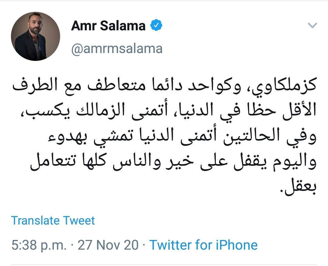وكتب عمرو سلامة قائلا: "كزملكاوي، وكواحد دائما متعاطف مع الطرف الأقل حظا في الدنيا، أتمنى الزمالك يكسب، وفي الحالتين أتمنى الدنيا تمشي بهدوء واليوم يقفل على خير والناس كلها تتعامل بعقل".