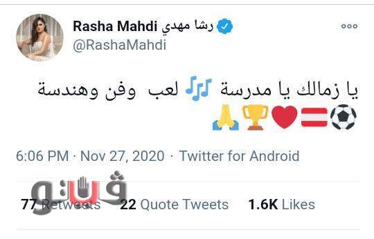 وكتبت رشا، عبر حسابها الشخصي على موقع التغريدات القصيرة "تويتر": "يا زمالك يا مدرسة لعب وفن وهندسة".