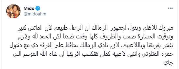 وكتب أحمد حسام "ميدو" تغريدة على تويتر: "مبروك للاهلي وبقول لجمهور الزمالك ان الزعل طبيعي لان الماتش كبير وتوقيت الخسارة صعب والظروف كلها وقفت ضدنا لكن الحمد لله ولازم نفخر بفريقنا وباللاعيبه.. لازم نادي الزمالك يحافظ على الفرقه دي مع دخول حمزه المثلوثي واتنين لاعيبه كمان هنكسب افريقيا ان شاء الله الموسم اللي جاي".