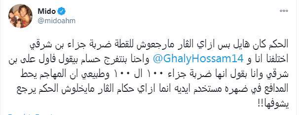 وقال: "الحكم كان هايل بس ازاي الڤار مارجعوش للقطة ضربة جزاء بن شرقي اختلفنا انا و@GhalyHossam14 واحنا بنتفرج حسام بيقول فاول على بن شرقي وانا بقول انها ضربة جزاء ١٠٠ ال ١٠٠ وطبيعي ان المهاجم يحط المدافع في ضهره مستخدم ايديه انما ازاي حكام الڤار مايخلوش الحكم يرجع يشوفها!!"
