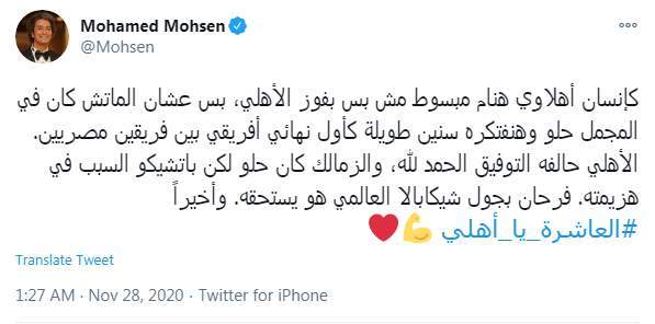وكتب محمد محسن قائلا: "كإنسان أهلاوي هنام مبسوط مش بس بفوز الأهلي، بس عشان الماتش كان في المجمل حلو وهنفتكره سنين طويلة كأول نهائي أفريقي بين فريقين مصريين.. الأهلي حالفه التوفيق الحمد لله، والزمالك كان حلو لكن باتشيكو السبب في هزيمته.. فرحان بجول شيكابالا العالمي هو يستحقه.. وأخيرا العاشرة يا أهلي".