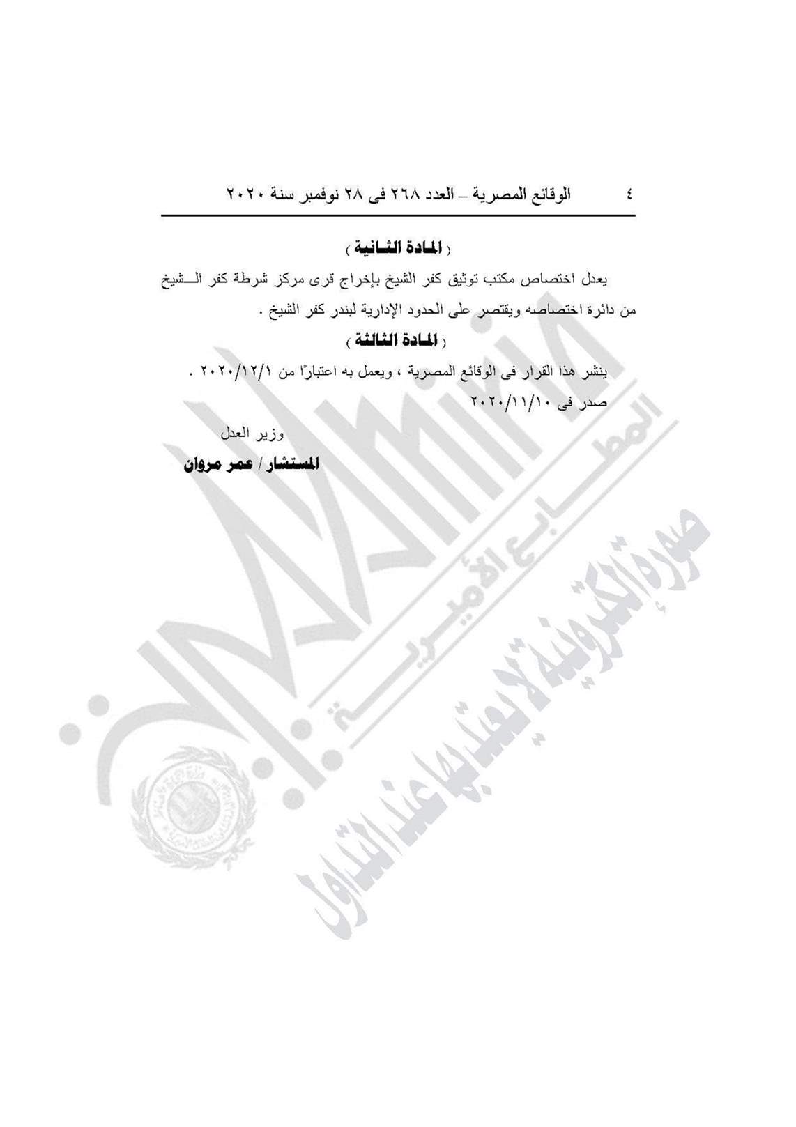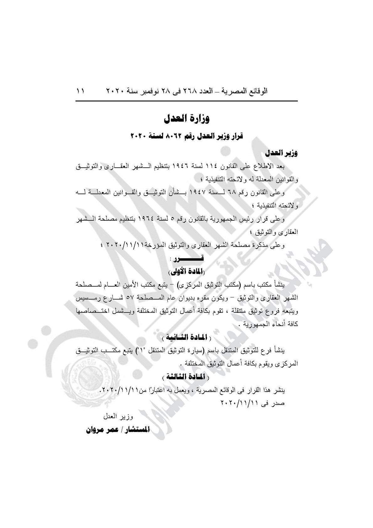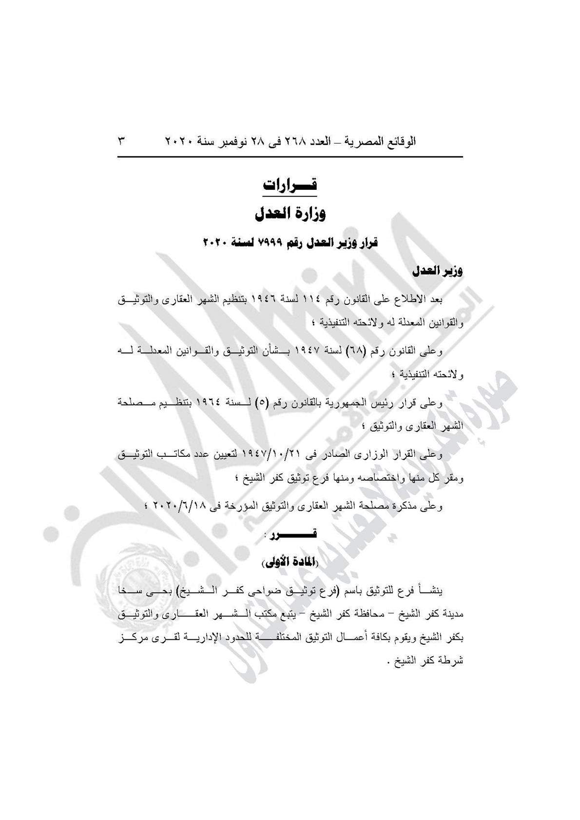 نشرت جريدة الوقائع المصرية في عددها رقم 268، الصادر في 28 نوفمبر 2020، 5 قرارات لوزير العدل المستشار عمر مروان، بشأن إنشاء فرعي توثيق ضواحى كفر الشـيخ و مكتب التوثيق المركزى برمسيس، وتأجيل سريان السجل العيني لعدد من المحافظات والأقسام.