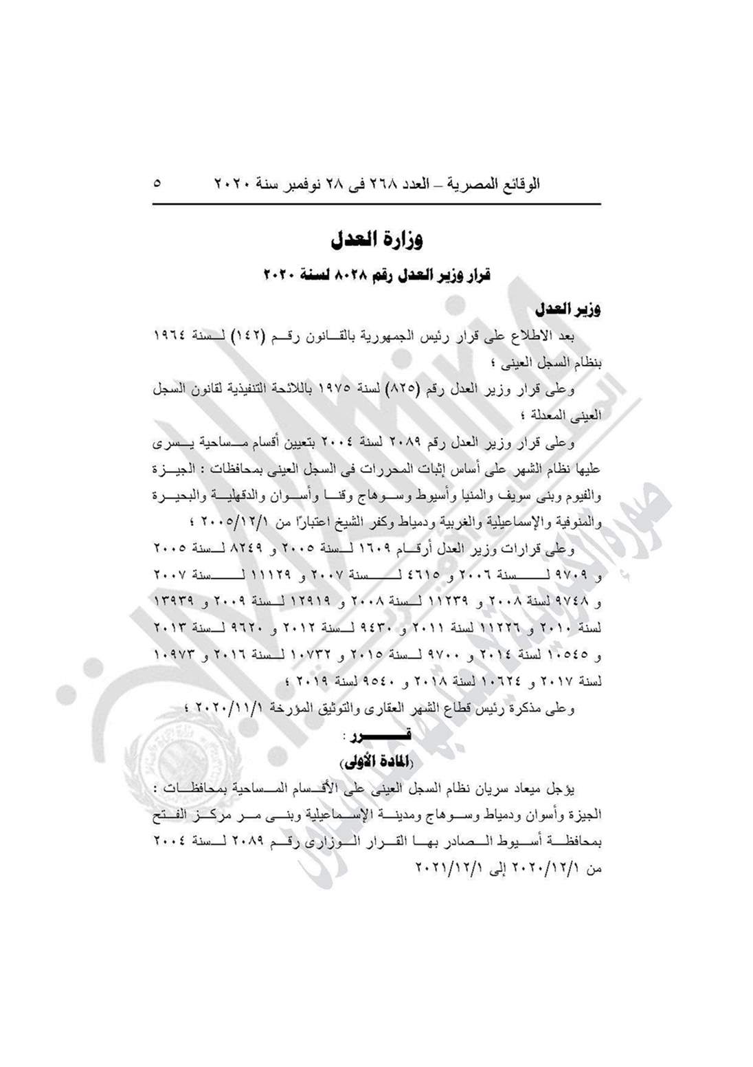 - القرار رقم 8028 لسنة 2020، بشأن تأجيل ميعاد سريان نظام السجل العينى على الأقسام المساحية بمحافظات (الجيزة وأسوان ودمياط وسوهاج ومدينة الإسماعيلية وبنى مر مركز الفتح بمحافظة أسيوط)، الصادر بها القرار الوزارى رقم 2089 لسنة 2004 من 1/12/2020 إلى 1/12/2021.