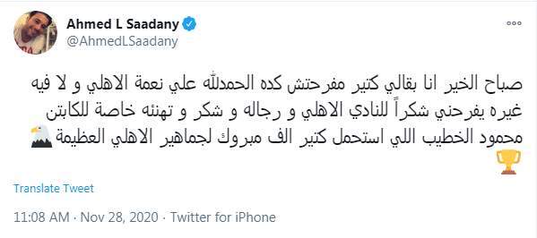 وكتب أحمد السعدني قائلا: "صباح الخير انا بقالي كتير مفرحتش كده الحمدلله علي نعمة الاهلي و لا فيه غيره يفرحني شكراً للنادي الأهلي ورجاله وشكر وتهنئة خاصة للكابتن محمود الخطيب اللي استحمل كتير ألف مبروك لجماهير الاهلي العظيمة".