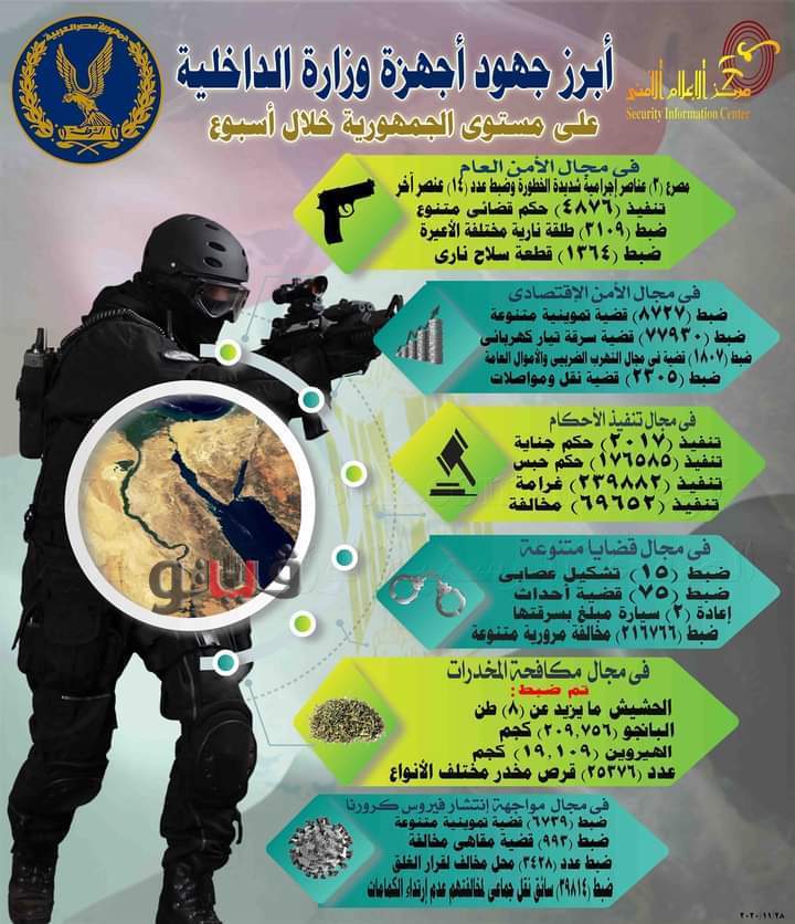 ضبط 2 ورشة لتصنيع الأسلحة النارية وبداخلهما (2 مسدس – 1 فرد محلى – أدوات وأجزاء التصنيع) ، (15) تشكيل عصابى ، ضموا (47) متهماً ، إرتكبوا (49) حادث سرقة متنوعة، (75) قضية أحداث بالإضافة إلى كشف غموض (57) حادث متنوع أبرزهم (قتل عمد ، سرقة بالإكراه ، حريق عمد ، إنتحال صفة) ، وتم ضبط مرتكبيها بإجمالى (87) متهماً و تنفيذ (488٫136) حكم قضائى .