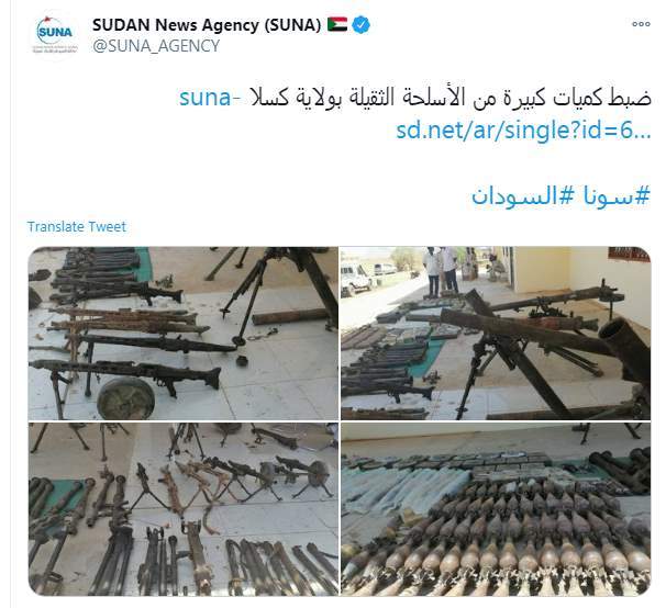 أكدت وكالة الأنباء السودانية "سونا"، عبر حسابها الرسمي بتويتر أن قوات الدعم السريع بقطاع كسلا تمكن من ضبط كميات كبيرة من الأسلحة والذخيرة ومختلف أنواع العتاد الحربي، فى إطار العمليات التى تقوم بها القوات الأمنية على الشريط الحدودي؛ تحسبا لأي مهددات أمنية انعكاسية نتيجة للصراع الدائر في اثيوبيا بمنطقة اقليم تيجراي المجاور لولاية كسلا.