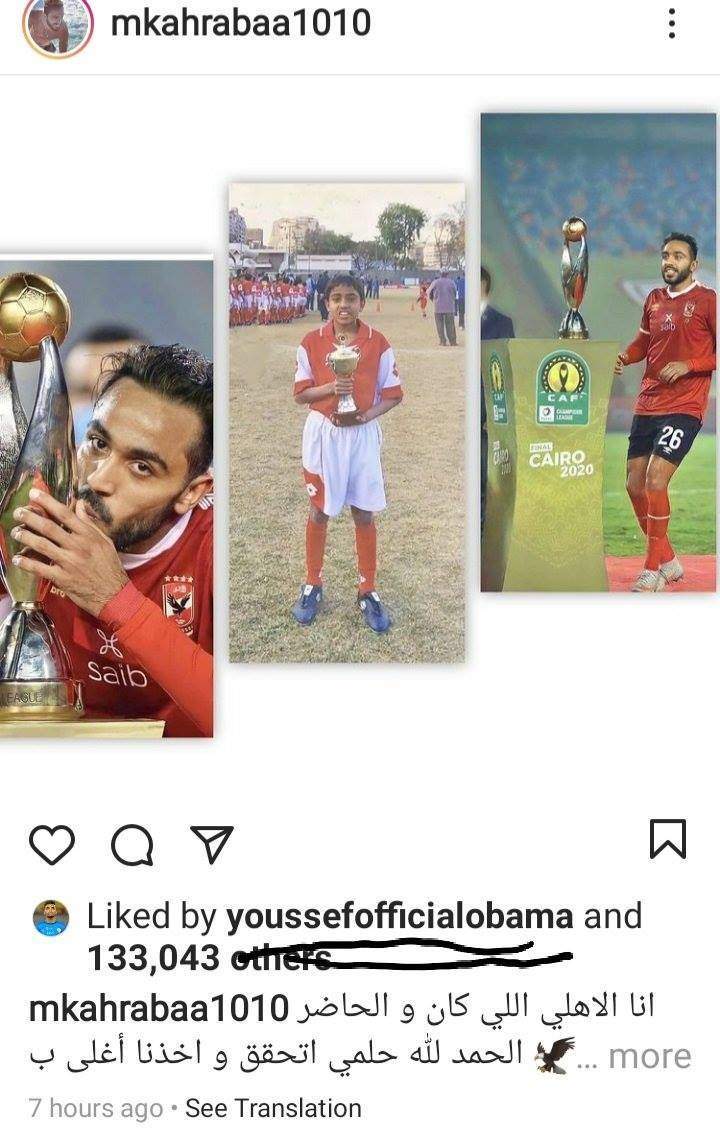 لاعب الأهلي الحالي، بتتويج فريقه بكأس دوري أبطال إفريقيا على موقع انستجرام حيث