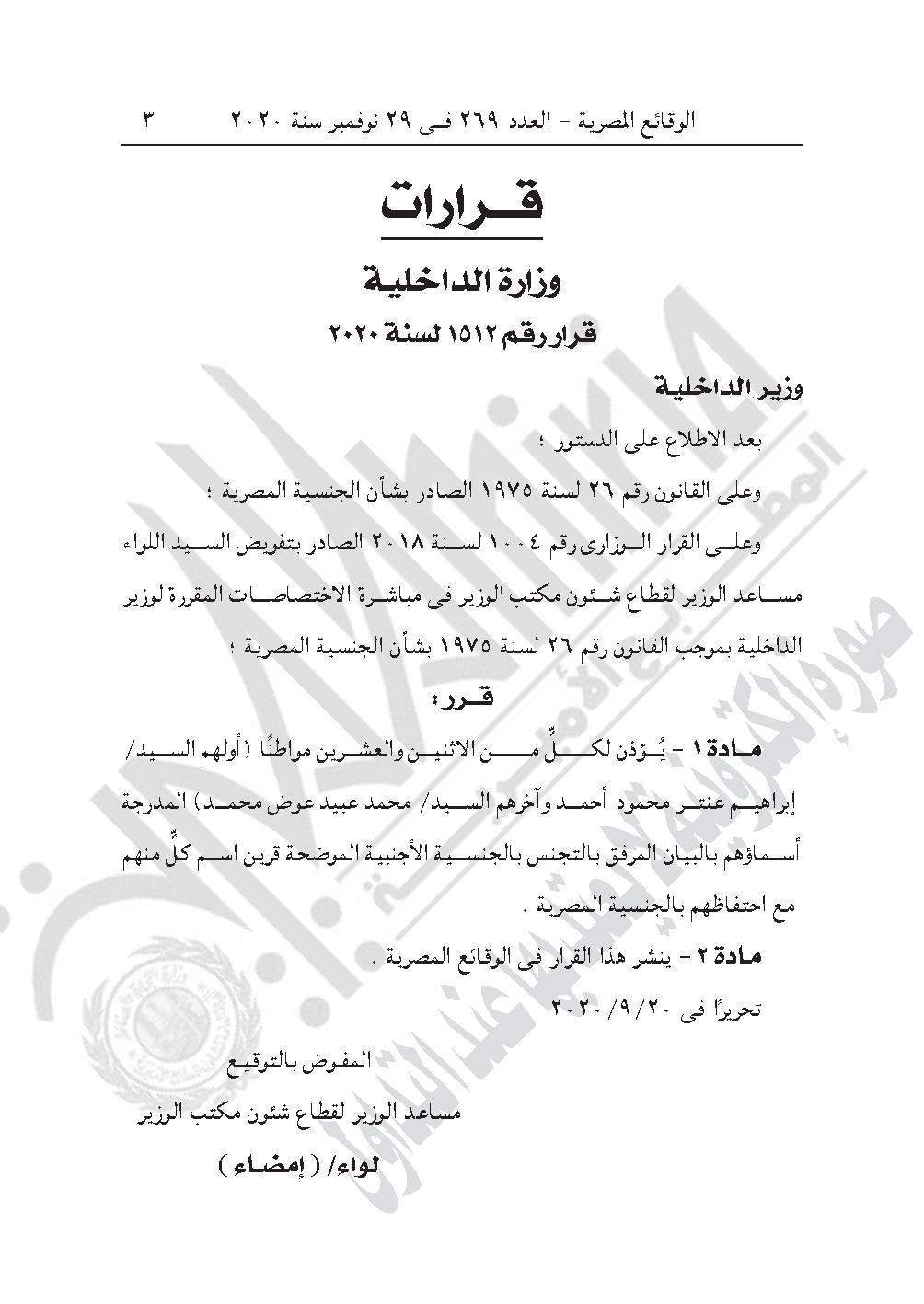 القرار رقم 1512 لسنة 2020، بشأن الأذن لكل من 22 مواطنًا (أولهم إبراهيم عنتر محمود أحمد وآخرهم محمد عبيد عوض محمد) المدرجة أسماؤهم بالبيان المرفق بالتجنس بالجنسية الأجنبية الموضحة قرين اسم كل منهم مع احتفاظهم بالجنسية المصرية .