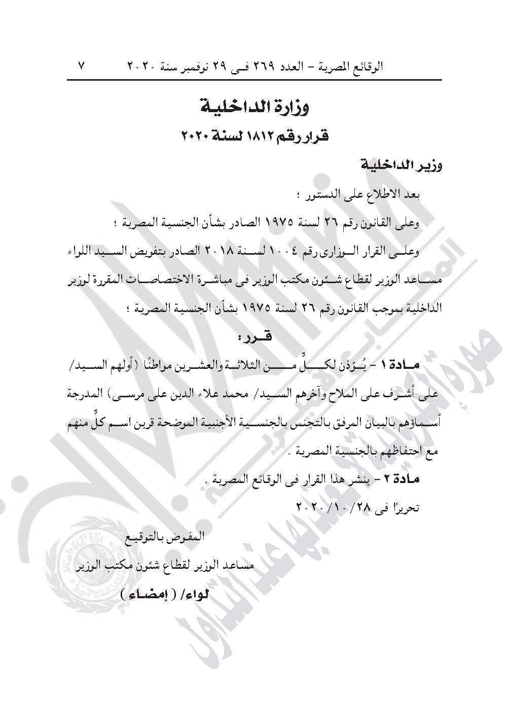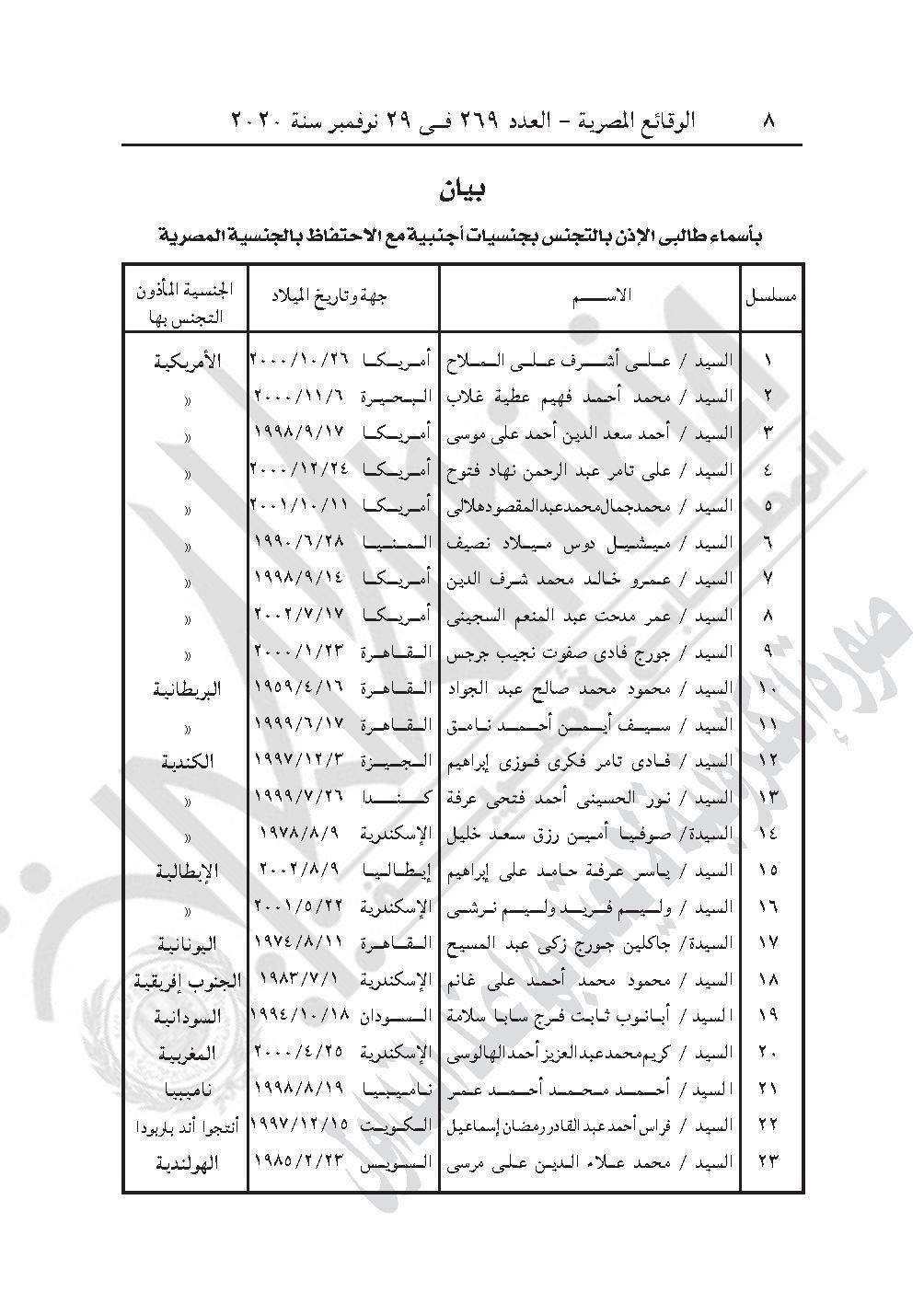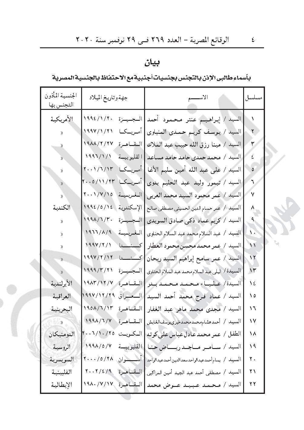 نشرت جريدة الوقائع المصرية في عددها رقم 269، الصادر في 29 نوفمبر 2020، 3 قرارات لوزارة الداخلية بشأن الأذن لـ45 مواطنًا التجنس بالجنسية الأجنبية ورد الجنسية المصرية لـ12 شخصًا.