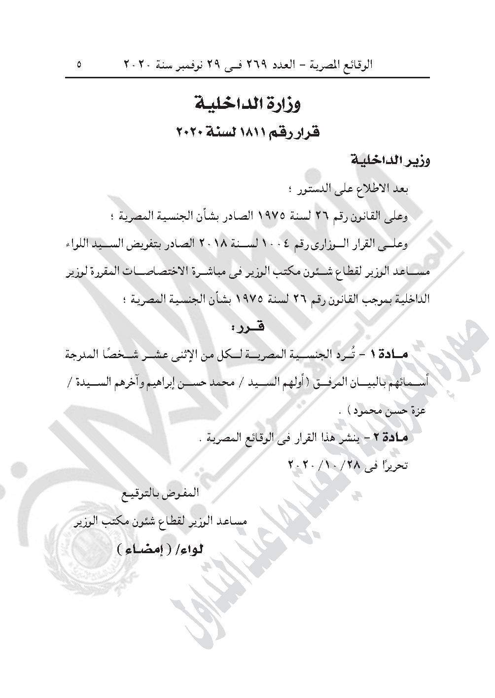 والقرار رقم 1811 لسنة 2020، برد الجنسية المصرية لـ12 شخصًا (أولهم محمد حسن إبراهيم وآخرهم عزة حسن محمود)