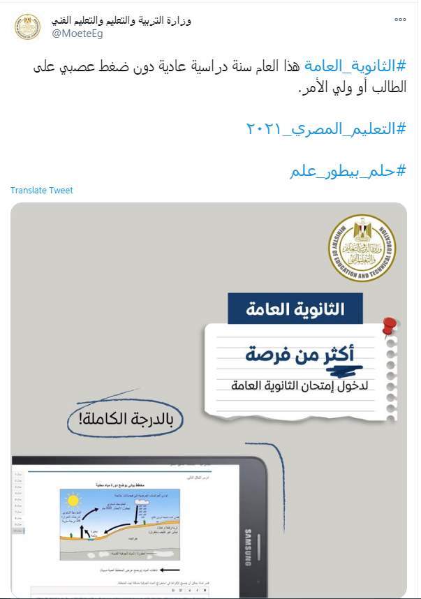 وكتبت وزارة التربية والتعليم عبر تويتر "#الثانوية_العامة هذا العام سنة دراسية عادية دون ضغط عصبي على الطالب أو ولي الأمر. #التعليم_المصري_٢٠٢١ #حلم_بيطور_علم"