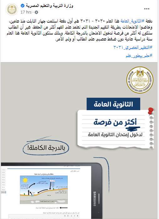 وكانت وزارة التربية والتعليم كتبت تدوينة سابقة على الفيس بوك قائلة: "دفعة #الثانوية_العامة هذا العام ٢٠٢٠ - ٢٠٢١ هي أول دفعة استلمت جهاز التابلت منذ عامين، وخاضوا الامتحانات بطريقة التقييم الجديدة التي تعتمد على الفهم أكثر من الحفظ، غير أن الطالب ستكون له أكثر من فرصة لدخول الامتحان بالدرجة الكاملة. وبذلك ستكون الثانوية العامة هذا العام سنة دراسية عادية دون ضغط عصبي على الطالب أو ولي الأمر. #التعليم_المصري_٢٠٢١.. #حلم_بيطور_علم"