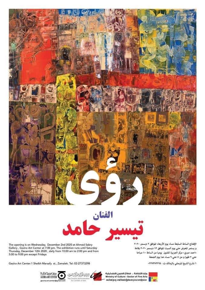 يفتتح قطاع الفنون التشكيلية برئاسة الدكتور خالد سرور، معرضاً فنياً معنون بـ "رؤي" للفنان تيسير حامد، وذلك في تمام السابعة من مساء يوم الأربعاء الموافق 2 ديسمبر 2020، يقام المعرض بقاعة أحمد صبري بمركز الجزيرة للفنون.