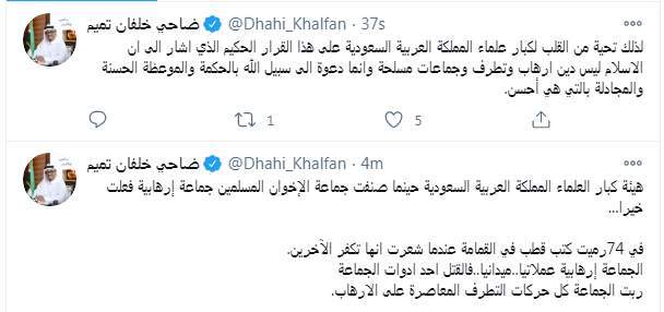 وكتب ضاحي خلفان تغريدة على تويتر قال فيها "هيئة كبار العلماء المملكة العربية السعودية حينما صنفت جماعة الإخوان المسلمين جماعة إرهابية فعلت خيرا... في 74 رميت كتب قطب في القمامة عندما شعرت انها تكفر الآخرين"