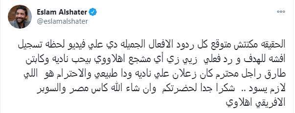 وكتب إسلام الشاطر تغريدة على تويتر "الحقيقه مكنتش متوقع كل ردود الافعال الجميله دي علي فيديو لحظه تسجيل افشه للهدف ورد فعلي زيي زي أي مشجع اهلاووي بيحب ناديه وكابتن طارق راجل محترم كان زعلان علي ناديه ودا طبيعي والاحترام هو اللي لازم يسود.. شكرا جدا لحضرتكم وان شاء الله كاس مصر والسوبر الافريقي اهلاوي".