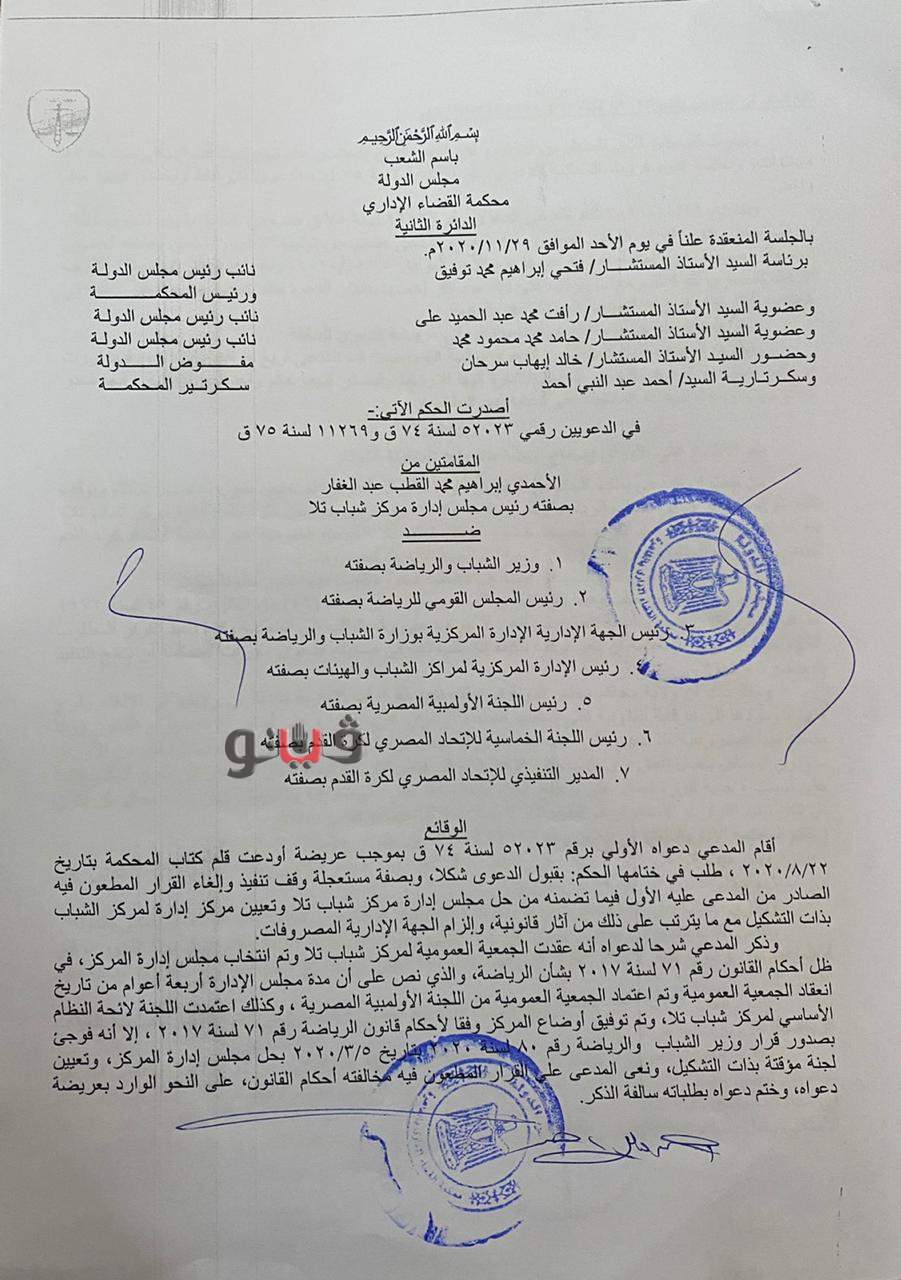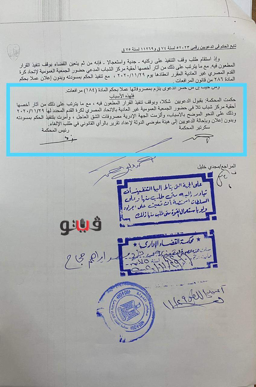 حصل مركز شباب تلا على حكم قضائي بوقف أعمال الجمعية العمومية لاتحاد الكرة، المنعقدة حاليا بأحد فنادق مدينة نصر.