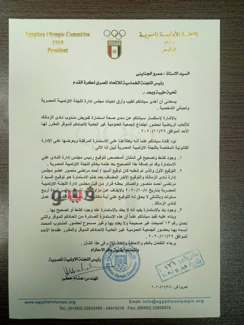 أرسلت اللجنة الأولمبية برئاسة هشام حطب، خطابا رسميا لمسئولي اللجنة الخماسية لاتحاد كرة القدم، برئاسة عمرو الجنايني، يؤكد صحة موقفهم من منع أحمد مرتضى منصور عضو مجلس إدارة نادي الزمالك من حضور الجمعية العمومية للجبلاية.