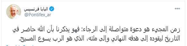 وكتب بابا الفاتيكان تغريدة على تويتر "زمن المجيء هو دعوة متواصلة إلى الرجاء: فهو يذكرنا بأن الله حاضر في التاريخ ليقوده إلى هدفه النهائي وإلى ملئه، الذي هو الرب يسوع المسيح".
