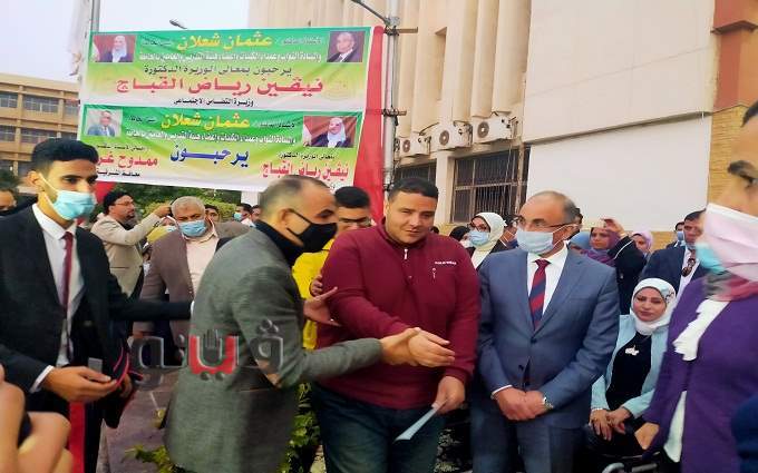 وكان في استقبالها الدكتور ممدوح غراب محافظ الإقليم والدكتور عثمان شعلان رئيس جامعة الزقازيق ومحمد كمال الحجاجي وكيل وزارة التضامن الاجتماعي ولفيف من القيادات التنفيذية.