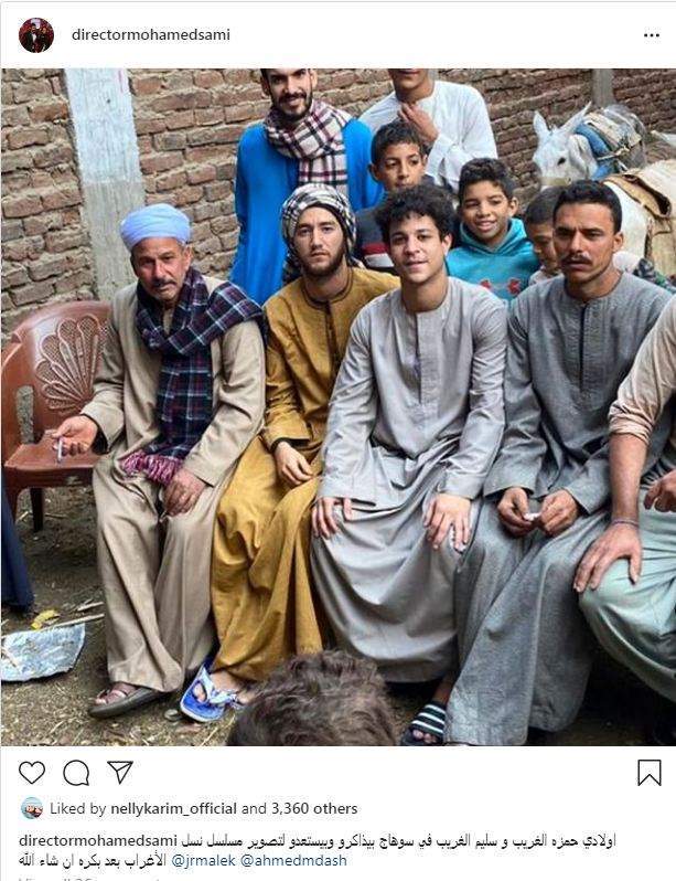 وظهر في الصورة كل من الفنان أحمد مالك، والفنان الشاب أحمد داش بالجلباب الصعيدي، فيما علق محمد سامي على الصورة قائلا: "أولادي حمزة الغريب وسليم الغريب في سوهاج بيذاكروا وبيستعدوا لتصوير مسلسل نسل الأغراب بعد بكرة إن شاء الله".