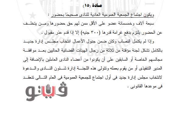 البند رقم 15 من لائحة الزمالك المعتمدة في آخر جمعية عمومية.