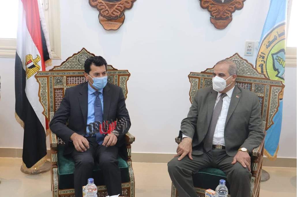 المحرصاوي يستقبل وزير الرياضة ويصطحبه في جولة بملاعب جامعة الأزهر | صور