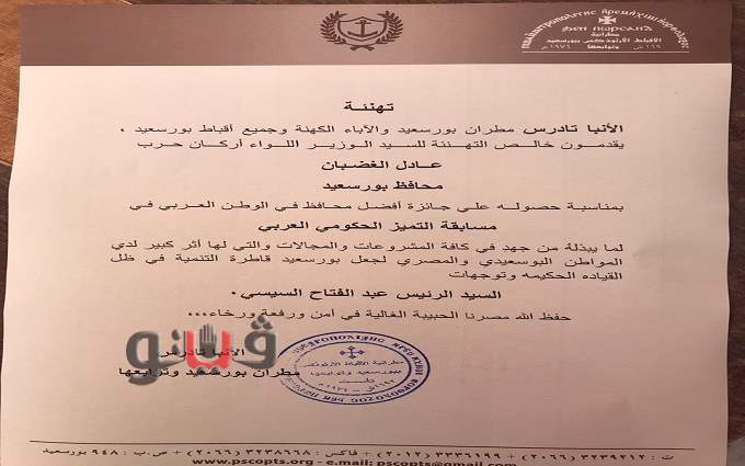 وأرسل مطران بورسعيد خلال البيان بإسمه وبإسم جميع الكهنه و أقباط المحافظة خالص التهنئه للمحافظ بمناسبة حصوله على جائزة أفضل محافظ فى الوطن العربى لما يبذله من جهد فى كافة المشروعات و المجالات و التى لها أثر كبير لدى المواطن البورسعيدى والمصرى ، لجعل بورسعيد قاطرة التنميه فى ظل القياده الحكيمه للرئيس عبد الفتاح السيسى.