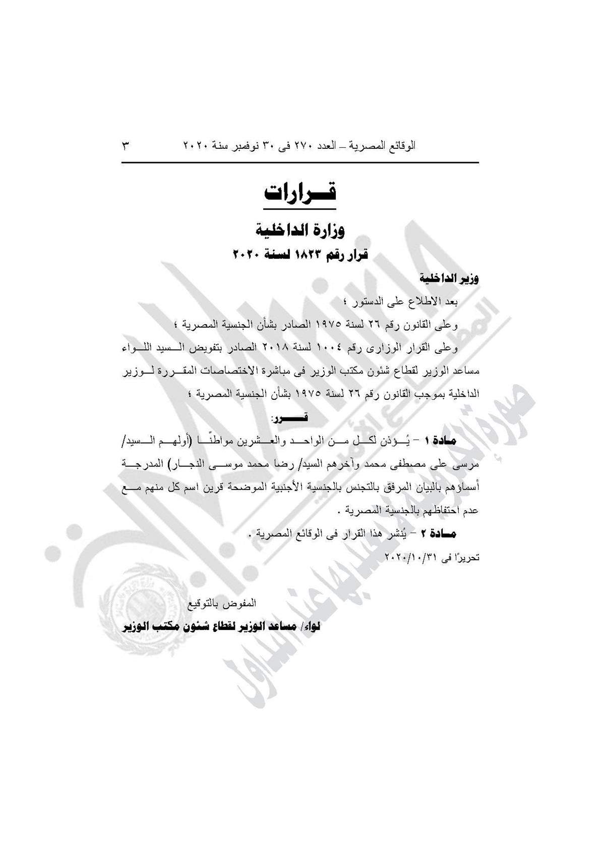 القرار رقم 1823 لسنة 2020، بالإذن لكل من الـ 21 مواطنًا (أولهم مرسى على مصطفى محمد، وآخرهم رضا محمد موسى النجار) المدرجة أسماؤهم بالبيان التجنس بالجنسية الأجنبية الموضحة قرين اسم كل منهم مع عدم احتفاظهم بالجنسية المصرية .