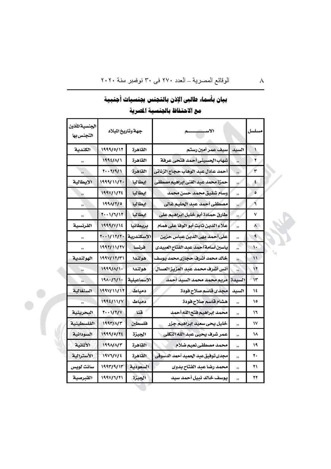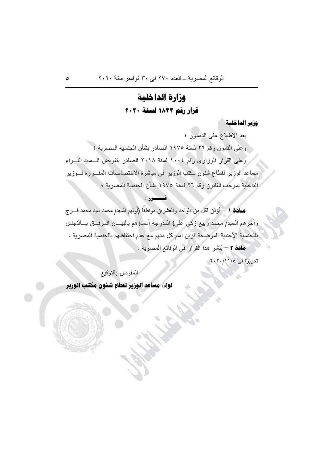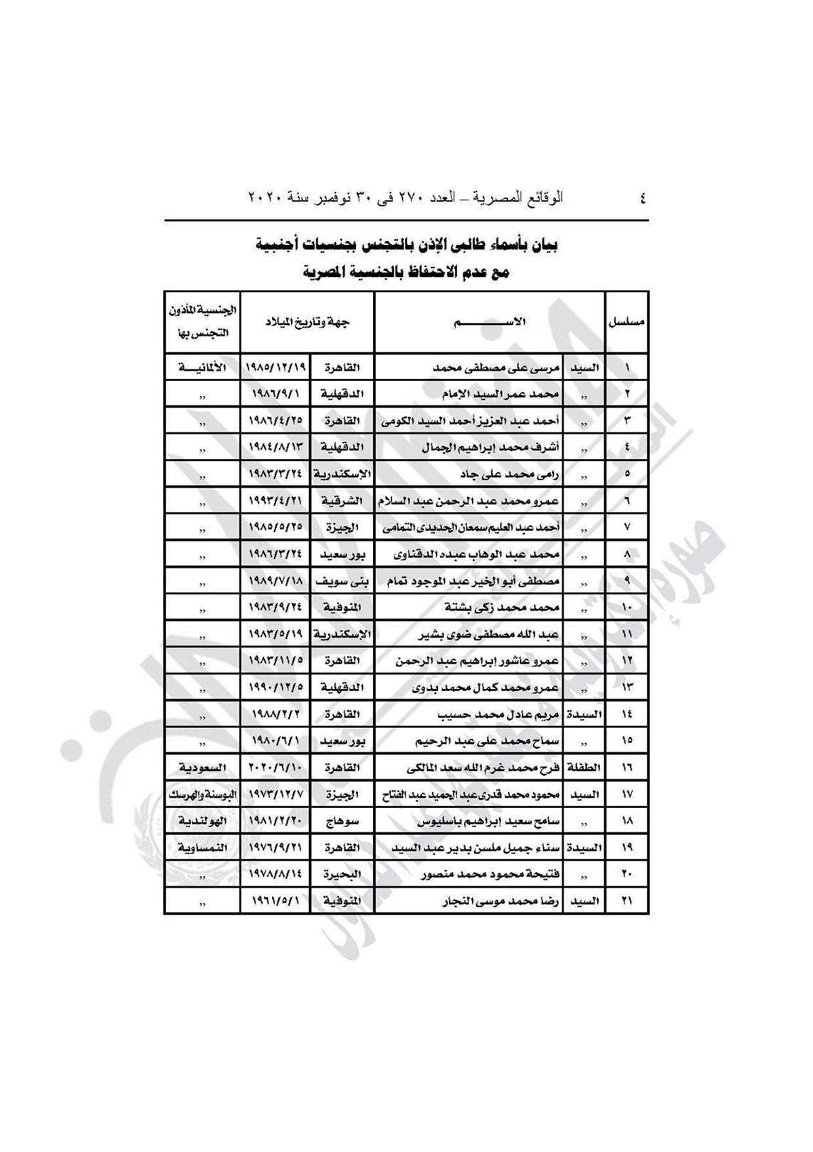 والقرار رقم 1833 لسنة 2020، بالأذن لكل من الـ 21 مواطنًا (أولهم محمد سيد محمد فراج، وآخرهممحمد ربيع زكي علي) المدرجة أسماؤهم بالبيان التجنس بالجنسية الأجنبية الموضحة قرين اسم كل منهم مع عدم احتفاظهم بالجنسية المصرية.