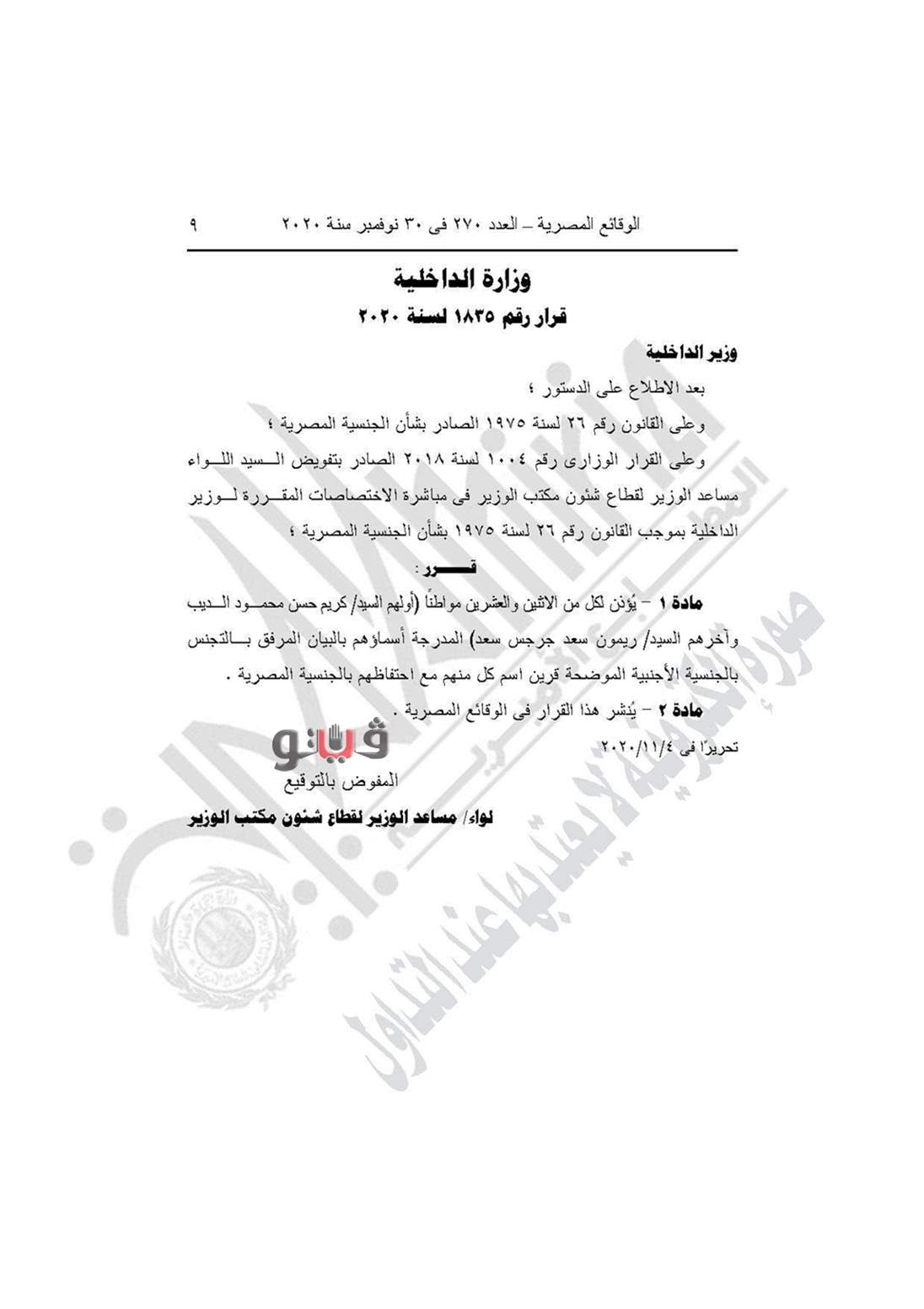 والقرار رقم 1835 لسنة 2020، بالأذن لكل من 22 مواطنًا (أولهم كريم حسن محمود الديب، وآخرهم ريمون سعد جرجس سعد) المدرجة أسماؤهم بالبيان بالتجنس بالجنسية الأجنبية الموضحة قرين اسم كل منهم مع احتفاظهم بالجنسية المصرية.