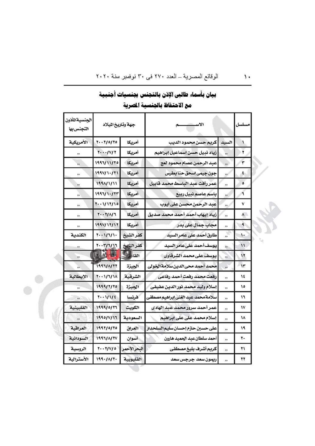 نشرت جريدة الوقائع المصرية في عددها رقم 270، الصادر في 30 نوفمبر 2020، 4 قرارات لوزارة الداخلية، بسحب الجنسية المصرية من 42 مواطنًا والسماح لـ44 مواطنًا التجنس بالجنسية الأجنبية.