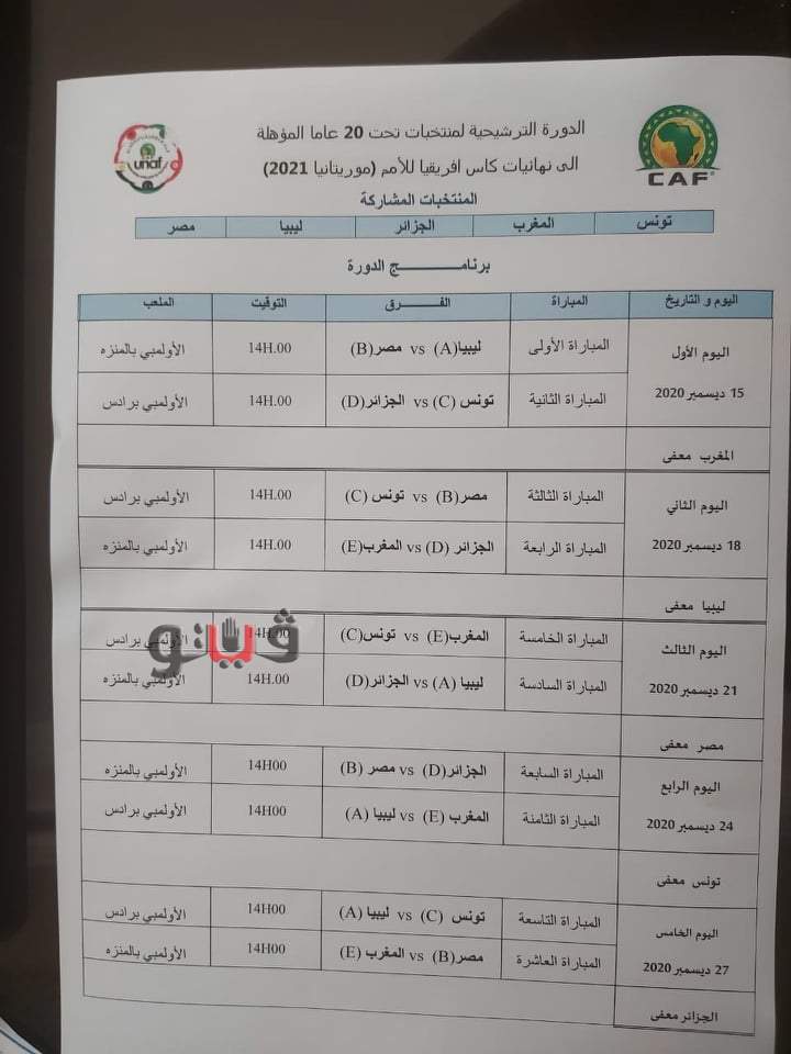 يخوض المنتخب مواجهاته ايام 15 و18 و24 و27 ديسمبر المقبل، حيث يفتتح مبارياته بمواجهة ليبيا في ستاد المنزة، ثم تونس في ستاد رادس، والجزائر في الجولة الرابعة على ستاد المنزة، واخيرا يلتقي مع المغرب بملعب المنزل، وتقام كل المباريات في الثانية ظهراً.