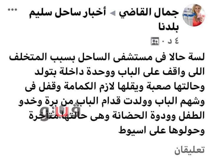 يذكر أن مستشفى ساحل سليم المركزي شهد خلال الشهر الماضي حالة مشابهة لحالة تلك السيدة حيث وضعت سيدة جنينها بطرقة المستشفى لعدم وجود الطبيب النوبتجي مما اضطر عاملات المستشفى لتوليد السيدة.
