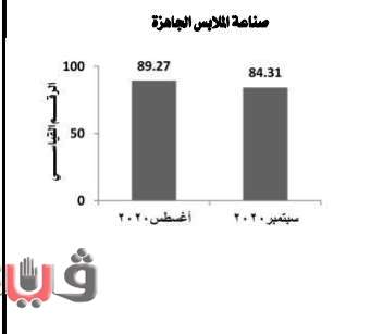 بلـغ الرقــــم القيـــاسـي لصناعة الملابس الجاهزة 84.31 خلال شهر سبتمبر 2020 مقارنة بشهر أغسطس 2020 حيث بلغ 89.27 بنسبة انخفاض قدرها 5.6% وذلك بسبب ركود حالة السوق والاعتماد على تواجد المخزون.