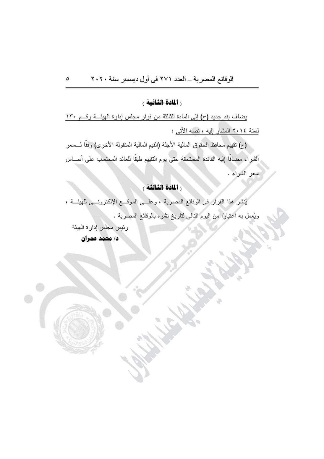 - القرار رقم 168 لسنة 2020، بتعديل قرار مجلس إدارة الهيئة رقم 130 لسنة 2014 بشأن ضوابط تقييم شركات خدمات الإدارة لصافى أصول صناديق الاستثمار وتحديد الأصول والأوراق المالية التى يتعين الاستعانة بمقيم متخصص ومستشار مالى مستقل لتقييمها.