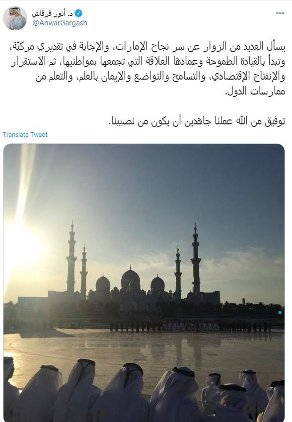 وكتب أنو قرقاش تغريدة على تويتر قال فيها: "يسأل العديد من الزوار عن سر نجاح الإمارات، والإجابة في تقديري مركبّة، وتبدأ بالقيادة الطموحة وعمادها العلاقة التي تجمعها بمواطنيها، ثم الاستقرار والإنفتاح الإقتصادي، والتسامح والتواضع والإيمان بالعلم، والتعلم من ممارسات الدول. توفيق من الله عملنا جاهدين أن يكون من نصيبنا".