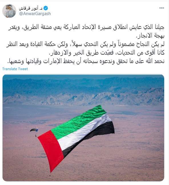 واضاف :"جيلنا الذي عايش انطلاق مسيرة الإتحاد المباركة يعي مشقة الطريق، ويقدر بهجة الانجاز. لم يكن النجاح مضموناً ولم يكن التحدي سهلاً، ولكن حكمة القيادة وبعد النظر كانا أقوى من التحديات، فعبّدت طريق الخير والازدهار. نحمد الله على ما تحقق وندعوه سبحانه أن يحفظ الإمارات وقيادتها وشعبها".