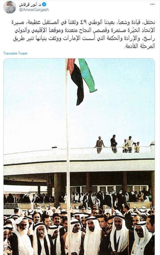 وكتب في تغرية سابقة: "نحتفل، قيادة وشعبا، بعيدنا الوطني ٤٩ وثقتنا في المستقبل عظيمة، مسيرة الإتحاد الخيّرة مستمرة وقصص النجاح متعددة وموقعنا الإقليمي والدولي راسخ، والإرادة والحكمة التي أسست الإمارات ووثقت بنيانها تنير طريق المرحلة القادمة".