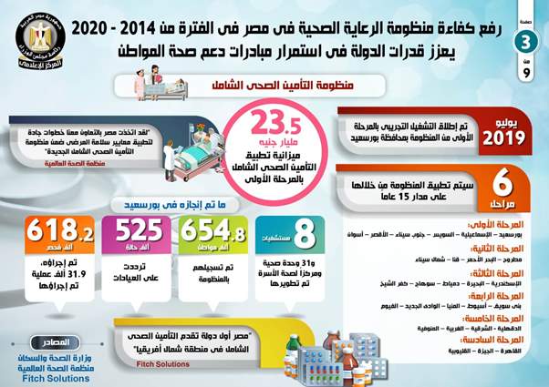 وأشار التقرير إلى أنه تم إطلاق التشغيل التجريبي بالمرحلة الأولى من منظومة التأمين الصحي الشامل بمحافظة بورسعيد في يوليو 2019، حيث تم تطوير 8 مستشفيات و31 وحدة صحية ومركزاً لصحة الأسرة، كما تم تسجيل نحو 654.8 ألف مواطن بالمنظومة، في حين بلغ عدد المترددين على العيادات نحو 525 ألف حالة، بينما تم إجراء 618.2 ألف فحص، و31.9 ألف عملية.