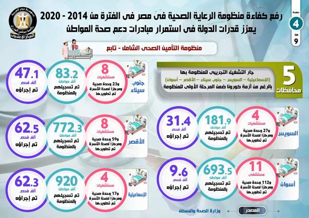 وبالنسبة لمحافظة الإسماعيلية، جاء في التقرير أنه تم تطوير 4 مستشفيات و17 وحدة صحية ومركزاً لصحة الأسرة، كما تم تسجيل نحو 920 ألف مواطن بالمنظومة، في حين تم إجراء 62.3 ألف فحص.