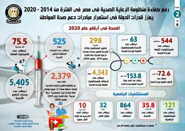 وأظهر التقرير أن إجمالي عدد المستشفيات التابعة لوزارة الصحة بلغ 544 مستشفى، تحتوي على 63 ألف سرير، بالإضافة إلى 4343 حضانة، بينما يعمل بهذه المستشفيات نحو 72.6 ألف طبيب و153.8 ألف عضو هيئة تمريض، وذلك حتى عام 2020، علماً بأنه تم تنفيذ 298 مشروعاً لتطوير المستشفيات و654 مشروعاً لتطوير وحدات ومراكز الرعاية الصحية خلال الفترة (يوليو 2014 – نوفمبر 2020).