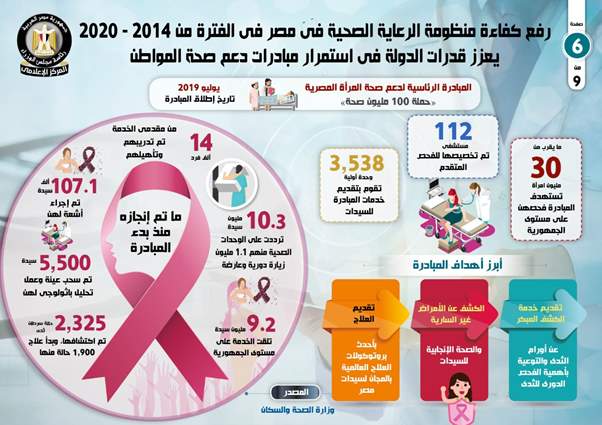 وقد بلغ عدد السيدات اللاتي تم إجراء أشعة لهن نحو 107.1 ألف سيدة، بينما تم سحب عينة لـ 5500 سيدة وعمل تحليل باثولوجي لهن، في حين تم اكتشاف 2325 حالة سرطان ثدي وبدأ علاج 1900 حالة منها.