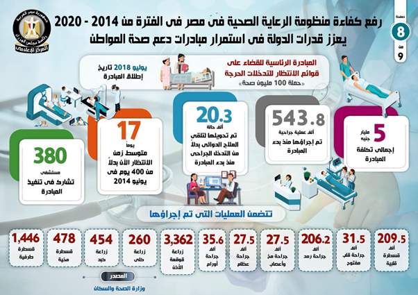 وأشار التقرير إلى أن المبادرة قد ساهمت في تقليل متوسط زمن الانتظار الآن إلى 17 يوماً بدلاً من 400 يوم في يونيو 2014، موضحاً أن المبادرة تضمنت إجراء 209.5 ألف قسطرة قلبية، و31.5 ألف جراحة قلب مفتوح، بالإضافة إلى إجراء 206.2 ألف جراحة رمد، و27.5 ألف جراحة مخ وأعصاب، وكذلك 27.5 ألف جراحة عظام، فضلاً عن إجراء 35.6 ألف جراحة أورام، و3362 زراعة قوقعة أذن، إلى جانب إجراء 454 زراعة كبد، و260 زراعة كلى، كما تم إجراء 478 قسطرة مخية، و1446 قسطرة طرفية.