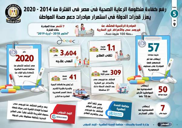 وفي هذا الصدد، أصدر المركز الإعلامي لمجلس الوزراء، تقريراً شمل إنفواجرافات سلط خلالها الضوء على رفع كفاءة منظومة الرعاية الصحية في مصر في الفترة من 2014 – 2020، والتي عززت من قدرات الدولة في استمرار مبادرات دعم صحة المواطن.